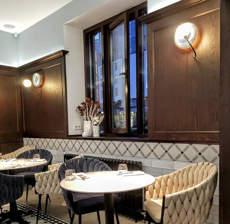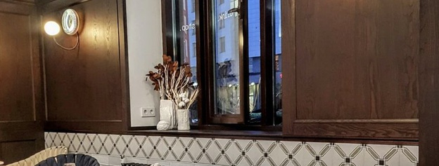 Уютное заведение с витринными окнами и стильным ремонтом.
