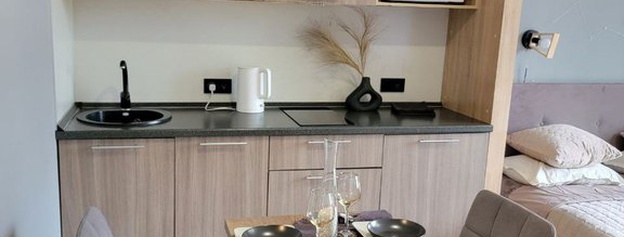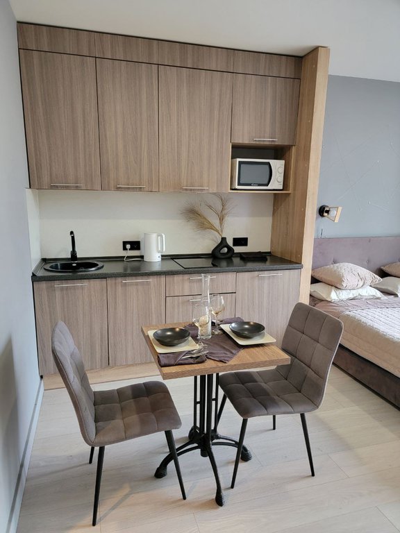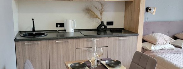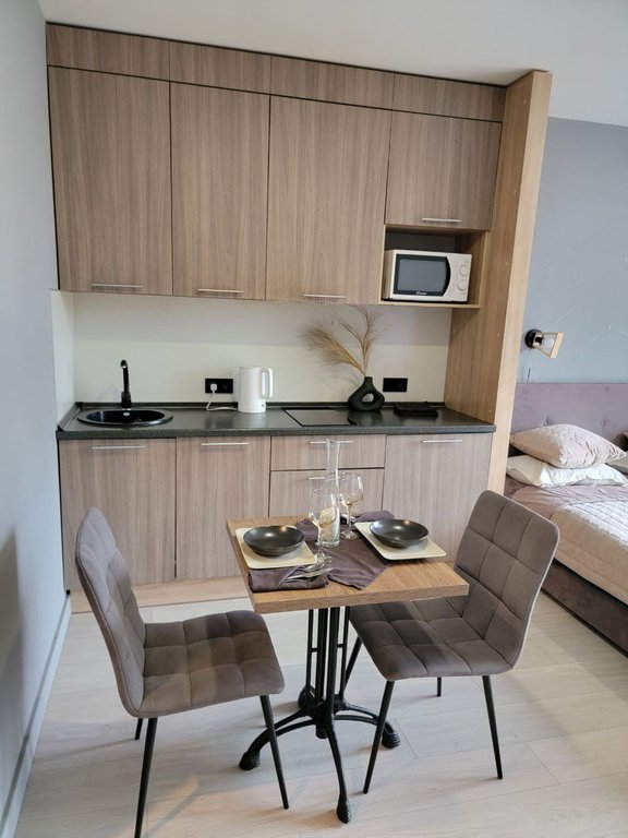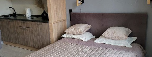Планировка свободная - организована уютная зона для отдыха и кухня. Санузел совмещен, с душевой кабиной.